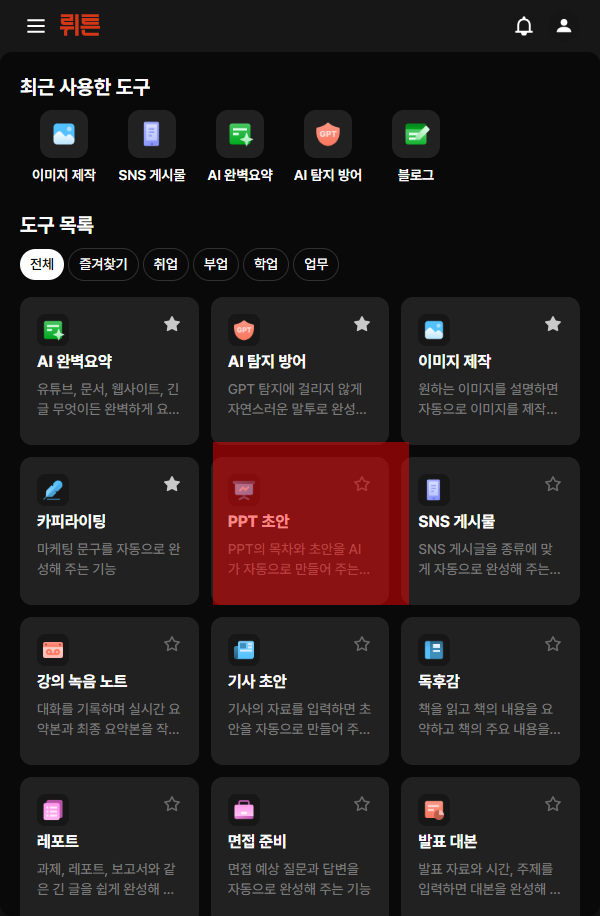 뤼튼 웹사이트에 로그인한 후, 왼쪽 메뉴에서 '도구 모음'을 클릭하세요. 그 다음 'PPT 초안 도구'를 찾아 클릭하면 됩니다. 주의할 점은 이 기능은 웹 버전에서만 사용 가능하다는 점이에요!