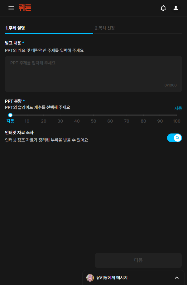 주제를 입력한 후, 발표의 목적과 대상 청중, 그리고 원하는 PPT 분량을 설정할 수 있어요: